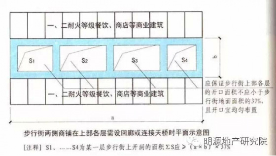 6.步行街兩側的商鋪在上部各層需設置回廊和連接天橋時,應保證步行街上部各層樓板的開口面積不應小于步行街地面面積的37%,且開口宜均勻布置;